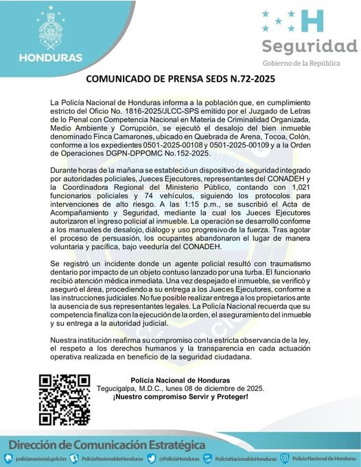 A pesar de que el desalojo no se efectuó y de que los ocupantes no abandonaron las fincas, la Policía Nacional de Honduras emitió un comunicado que no se corresponde con lo acontecido. “A la 1:15 p. m. se suscribió el acta de acompañamiento y seguridad, mediante la cual los jueces ejecutores autorizaron el ingreso policial al inmueble… Tras agotar el proceso de persuasión, los ocupantes abandonaron el lugar de manera voluntaria y pacífica, bajo veeduría del Conadeh. Se registró un incidente donde un agente policial resultó con traumatismo dentario por impacto de un objeto contuso lanzado por una turba.