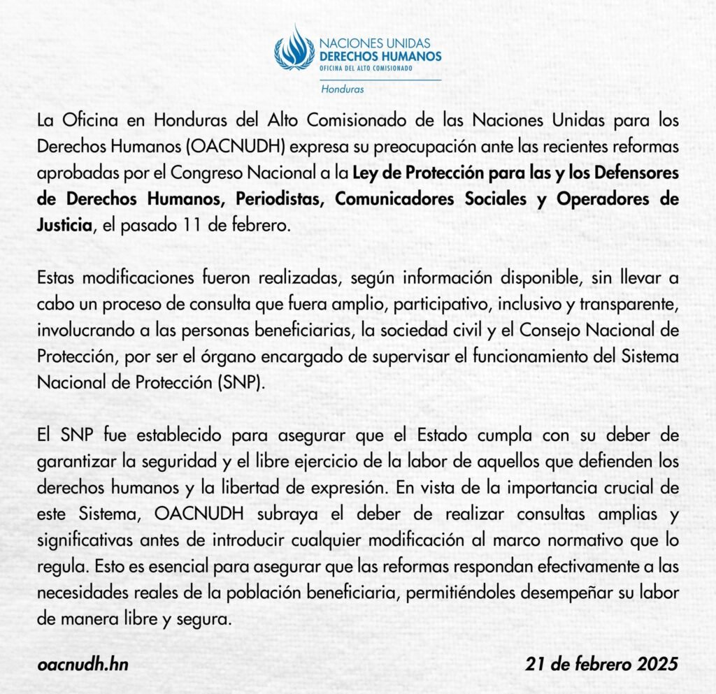 La Oficina del Alto Comisionado de las Naciones Unidas para los Derechos Humanos en Honduras reiteró la importancia de que las reformas a los mecanismos de protección se realicen mediante consultas amplias e inclusivas.